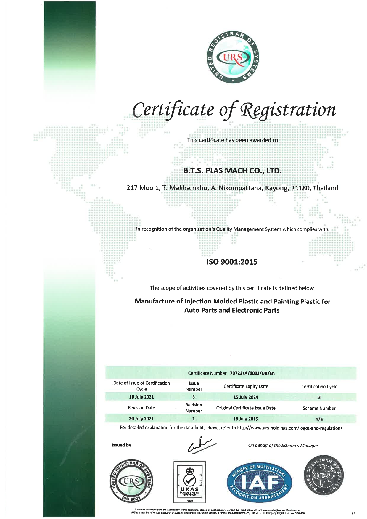 บริษัท บี.ที.เอส.พลาส แมช จำกัด เป็นผู้ผลิตงานฉีดขึ้นรูปพลาสติกและพ่นสี สำหรับกลุ่มธุรกิจอุตสาหกรรมทั่วไป อุตสาหกรรมอิเล็กทรอนิกส์ และอุตสาหกรรมยานยนต์ ได้ผ่านการรับรองระบบคุณภาพ ISO 9001:2015